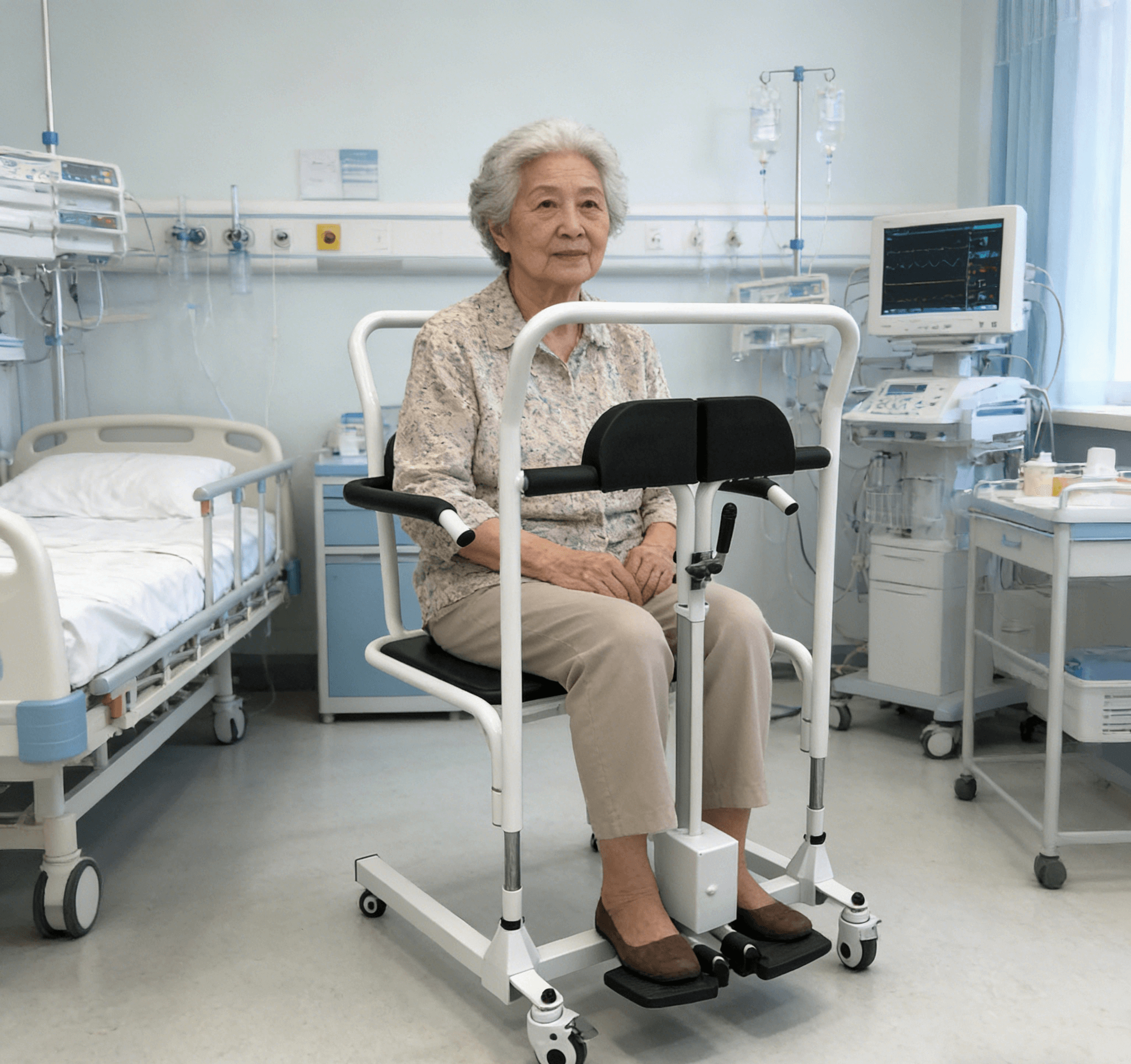 Electric care beds can lower the mattress to a minimum height (approximately 40 cm), making it easier to slide the sling underneath. Raising the bed also allows caregivers to operate while standing, reducing bending strain—this is especially important for patients with complete mobility impairment.